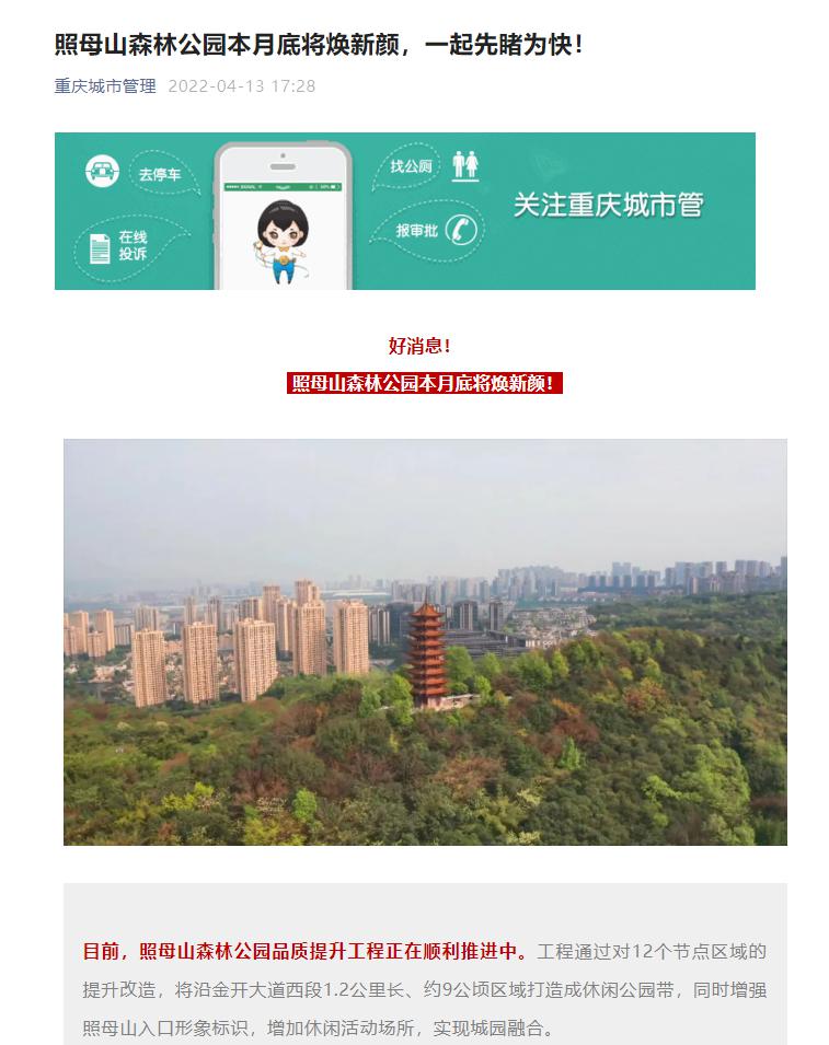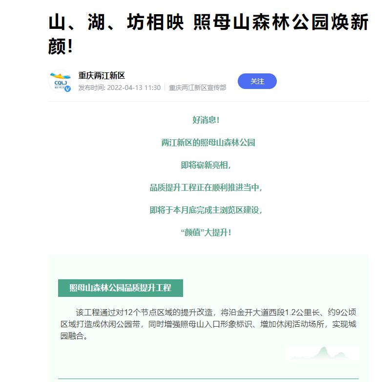 近期,包括兩江新區(qū)、重慶市城管局、搜狐網(wǎng)、瀟湘晨報(bào)等多家單位微信公眾號(hào)或視頻號(hào)報(bào)道了兩江建設(shè)公司承建的照母山森林公園品質(zhì)提升項(xiàng)目建設(shè)成果,在網(wǎng)絡(luò)上引來(lái)了不少關(guān)注度。