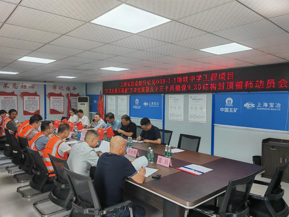 6月26日上午,O38-1-1地塊中學(xué)工程施工單位組織召開“五比五賽五滿意”立功競賽暨大干三個(gè)月確保9.30 結(jié)構(gòu)封頂誓師動(dòng)員會(huì)。兩江建設(shè)公司代建部經(jīng)理萬榮、副經(jīng)理陶東海,華興公司總監(jiān)甘雄貴,上海寶冶集團(tuán)工會(huì)主席陽剛,上海寶冶集團(tuán)成都分公司黨委副書記、工會(huì)主席徐晨堯參加會(huì)議。